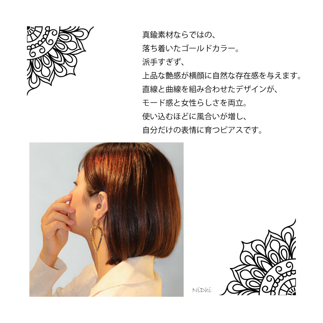 真鍮素材ならではの、落ち着いたゴールドカラーが魅力のピアス。