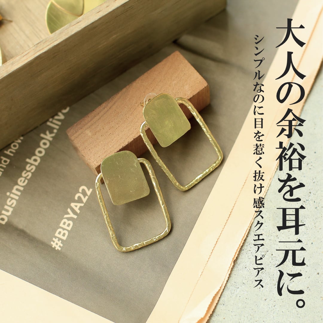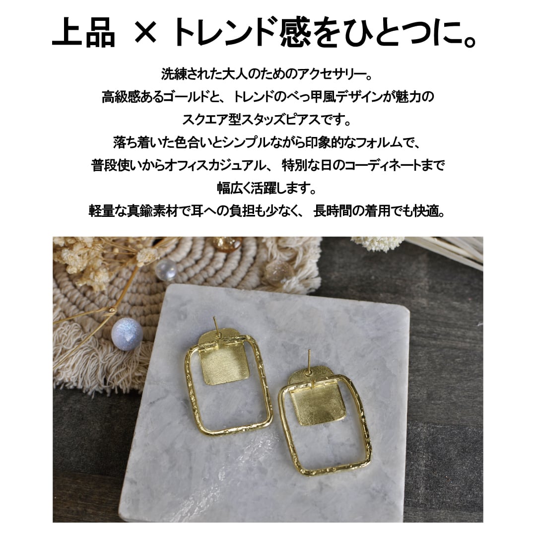 ゴールドとべっ甲風の組み合わせが魅力的なスクエアスタッズピアスは、大人の上品さを引き立てるアクセサリーです。真鍮素材を使用し、シンプルながらも高級感を演出します。デイリー使いに最適で、特別な日にも華やかさを添えます。